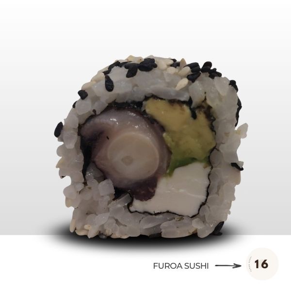 Roll envuelto en Sésamo o Ciboulette a elección, con Pulpo, Queso Crema y Palta.