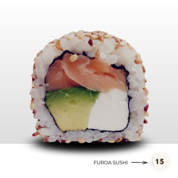 Roll envuelto en Sésamo o Ciboulette a elección, con Salmón, Palta y Queso Crema.