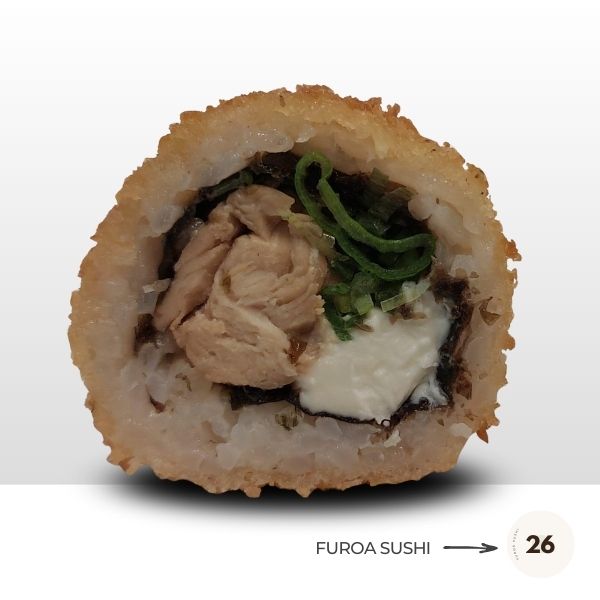 Roll envuelto en Panko o Tempura a Elección, con Pollo Teriyaki, Queso Crema y Cebollín.