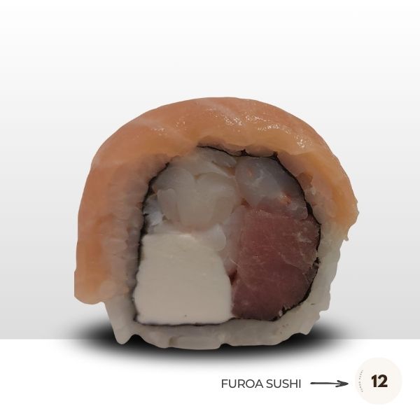 Roll envuelto en Salmón con Atún, Camarón y Queso Crema.