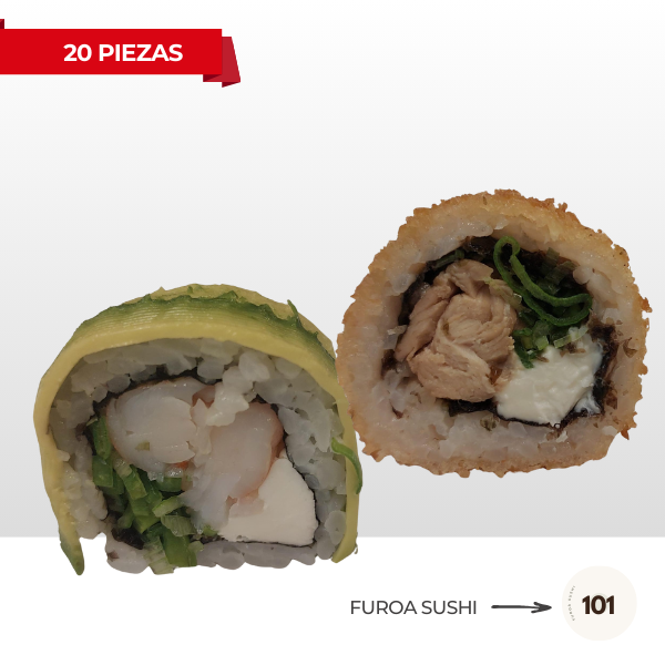 Roll envuelto en Palta con Camarón, Queso Crema y Cebollín.