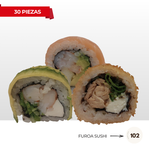 Roll envuelto en Salmón con Kanikama, Queso Crema y Palta.