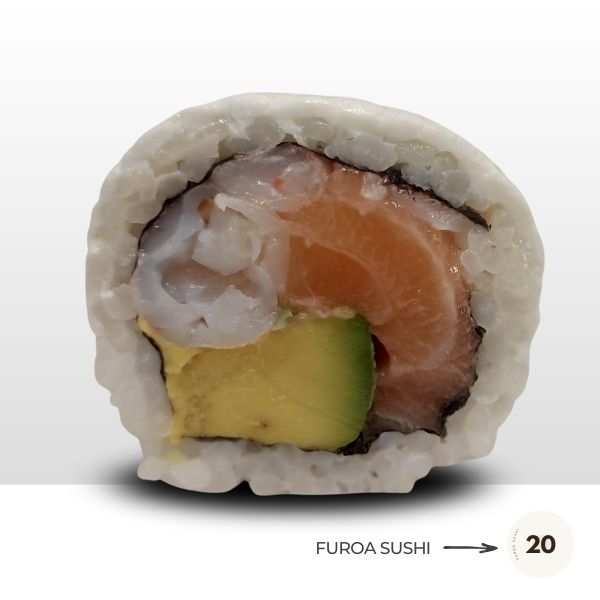 Roll envuelto en Queso Crema con Salmón, Camarón y Palta.