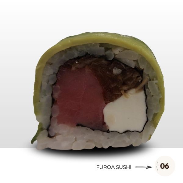 Roll envuelto en palta con Atún, Queso Crema y Ciboulette.